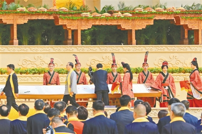 祈福中華。拜祖臺上,一幅波濤壯闊的黃河畫卷徐徐展開。古小玉、何新、劉家強、符之冠、陸進、徐顯明、孫達,中央統(tǒng)戰(zhàn)部九局二級巡視員孫彥濤,國家文化和旅游部一級巡視員王鶴云,中國工程院院士、全國勘察設(shè)計大師何鏡堂,中國工程院院士、第二屆國醫(yī)大師王琦,中國工程院院士、華東合成生物產(chǎn)業(yè)技術(shù)研究院負責(zé)人鄭裕國,全國政協(xié)委員、北京大學(xué)教授張頤武,中國文聯(lián)書記處原書記、中國電影家協(xié)會分黨組原書記張宏,中國美術(shù)家協(xié)會分黨組書記、中國美術(shù)家協(xié)會副主席馬鋒輝,中國戲劇家協(xié)會分黨組書記、駐會副主席陳涌泉,中國食品藥品企業(yè)質(zhì)量安全促進會會長毛振賓,國學(xué)專家、講席教授、北京中醫(yī)藥大學(xué)國學(xué)院創(chuàng)院院長張其成,知名學(xué)者、浙江大學(xué)求是特聘教授鄭強,資深媒體專家胡錫進,中歐經(jīng)濟文化研究發(fā)展中心會長柯海嘯,中國男高音歌唱家、河南音樂學(xué)院院長戴玉強,河南鄧亞萍體育產(chǎn)業(yè)投資基金董事長鄧亞萍,全國政協(xié)委員、知名作家蔣勝男,首屆岐黃學(xué)者、河南中醫(yī)藥大學(xué)校長王耀獻,全國人大代表、依文集團董事長夏華,同仁堂集團董事長王貴平,香港中資基金業(yè)協(xié)會會長連少冬,中鐵工程裝備集團有限公司董事長趙華,國家級非物質(zhì)文化遺產(chǎn)石雕項目代表性傳承人劉紅立,在畫卷上蓋印,以黃河為證,祝福國家安泰、海宇寧謐。
