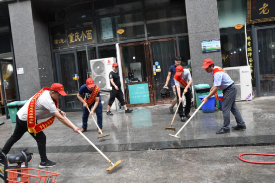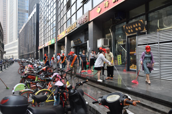 二、“全城清潔”行動。清潔家園,黨員志愿者義不容辭。日前,市建投聯(lián)合商務(wù)社區(qū)積極響應(yīng)“全城清潔”行動號召,定期組織志愿者對社區(qū)單位公共區(qū)域、沿街商戶門店等內(nèi)外環(huán)境進(jìn)行集中整治。7月14日下午,市建投黨員志愿者分赴中國人保大廈對沿街商戶門店和街道進(jìn)行集中清理。大清掃活動采取包干打掃、分頭行動的方式,集中對沿街商鋪門店垃圾桶(池)、地面污漬等進(jìn)行清洗,全面清理整治各類衛(wèi)生死角,清理積存垃圾,杜絕垃圾亂堆亂放。烈日炎炎,市建投黨員志愿者們絲毫不懼37度的高溫,頭戴小紅帽,戴著紅袖標(biāo),以高度的敬業(yè)態(tài)度和為人民服務(wù)的無比熱情,全身心投入到環(huán)境衛(wèi)生清理中,通過2個小時的辛苦勞動,使人保大廈沿街門店商鋪和街道面貌煥然一新。