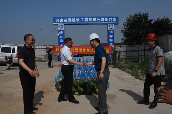 盛夏時節(jié),高溫炎熱。6月22日上午,由集團公司黨委和工會主辦,市政工程建設(shè)管理中心、綜合部、黨群部承辦的“送清涼、保健康、促和諧”慰問活動,走進市政工程建設(shè)施工現(xiàn)場,為烈日下辛勤工作的一線工人兄弟送去西瓜、水等防暑降溫物資,送上集團公司的親切關(guān)懷和問候。