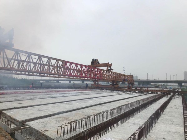 該橋橋梁斷面采用兩幅橋形式,橋梁全寬50.6米,全長(zhǎng)184.2米。針對(duì)橋梁施工范圍內(nèi)涉及地鐵4號(hào)線盾構(gòu)頂進(jìn)和賈魯河綜合治理等多部門(mén)多作業(yè)施工,我公司邀請(qǐng)了省內(nèi)知名專(zhuān)家進(jìn)行專(zhuān)項(xiàng)方案評(píng)審把關(guān)。在建設(shè)過(guò)程中,精心組織,統(tǒng)籌協(xié)調(diào),克服了現(xiàn)場(chǎng)條件復(fù)雜、汛期施工難度大等不利因素的影響,抓質(zhì)量,促進(jìn)度,保安全,順利地實(shí)現(xiàn)了橋梁合龍這一關(guān)鍵節(jié)點(diǎn)。